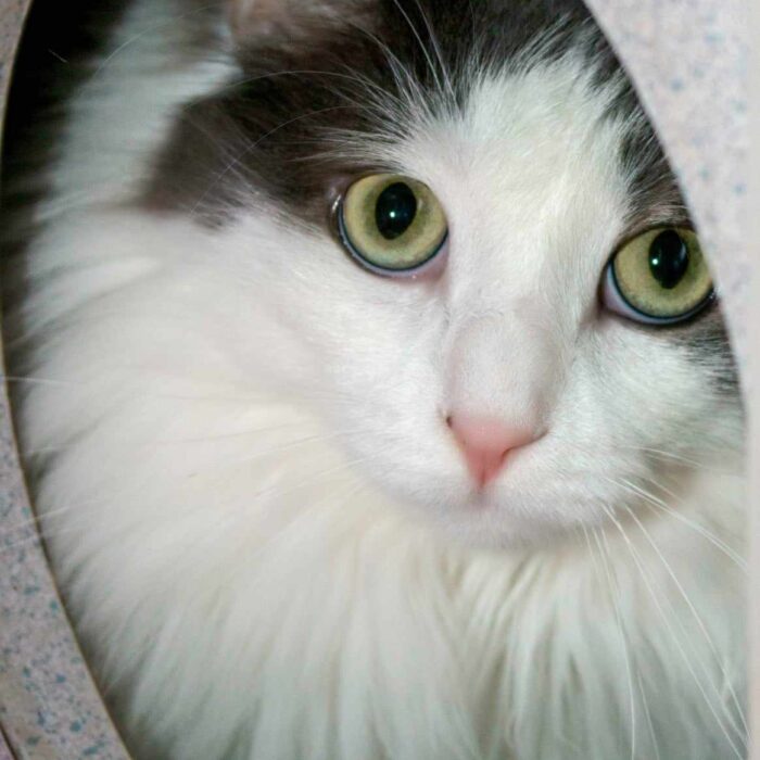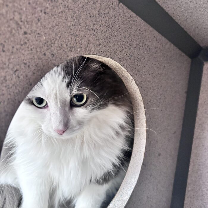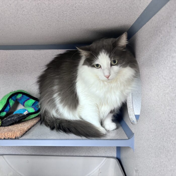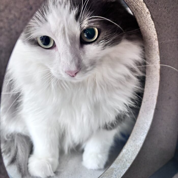 One of the most beautiful long-haired kitties ever, this is Mystic! Mystic is quite skittish, but we know she is just waiting for her perfect person to find her and help her out of her shell. She is quiet and would flourish in a home with soft gentle people who give her time and space and sweet encouragement to gain her confidence!