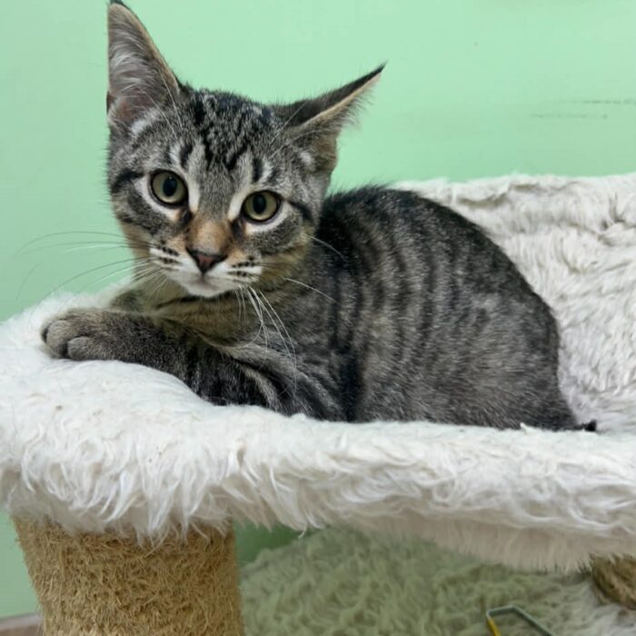This is Quillow! She is a brown tabby and is one of our 4 tabby siblings. They love to play together and can be hard to tell apart! She can be a little shy just like her sister Clawdia, but we know that she would make a wonderful pet! Come get to know her, and we guarantee you’ll fall in love!